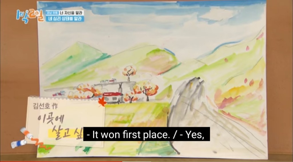 Since it’s a “Know Yourself” episode, the psychologist analyzed his artwork, translating every detailed piece about the internal aspect of the actor at that time. The chimney and smoke represent his inner conflicts, the mountains signify the number of issues he must resolve and how he is absorbed in them, constantly thinking about personal things within him. Whereas, the water that changed into a road means his subconscious motives of looking anxiously at life’s responsibilities changed into a reality.