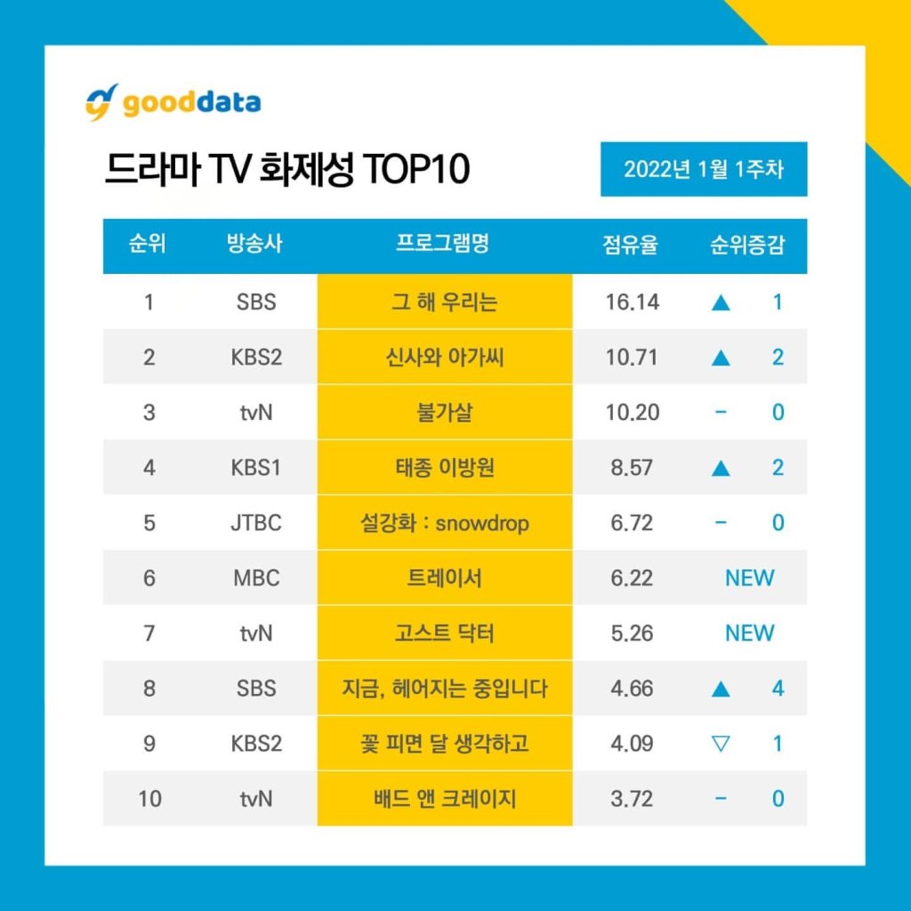 According to Good Data Corporation, the ongoing series, Our Beloved Summer and its main stars Kim Da-mi and Choi Woo-shik topped the list of rankings.