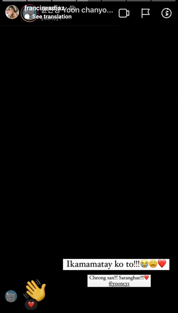 Surprised, the young Filipina actress shared the actor’s message on her Instagram story, expressing, “I’m gonna die!!!” and tagged Yoon Chan-young, saying, “Cheong san!!! I love you!”