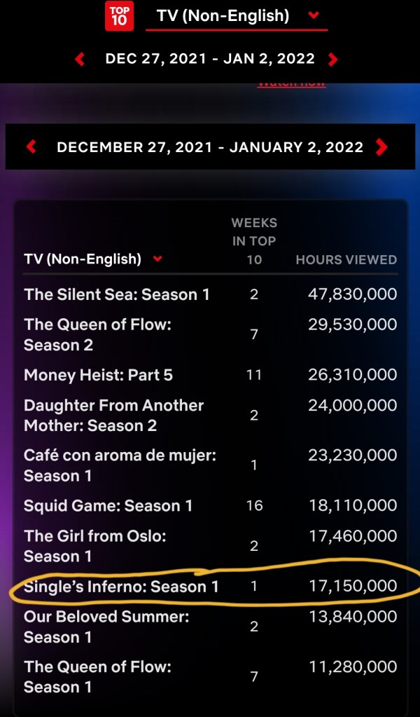 6. Single’s Inferno | 17.1 million hours