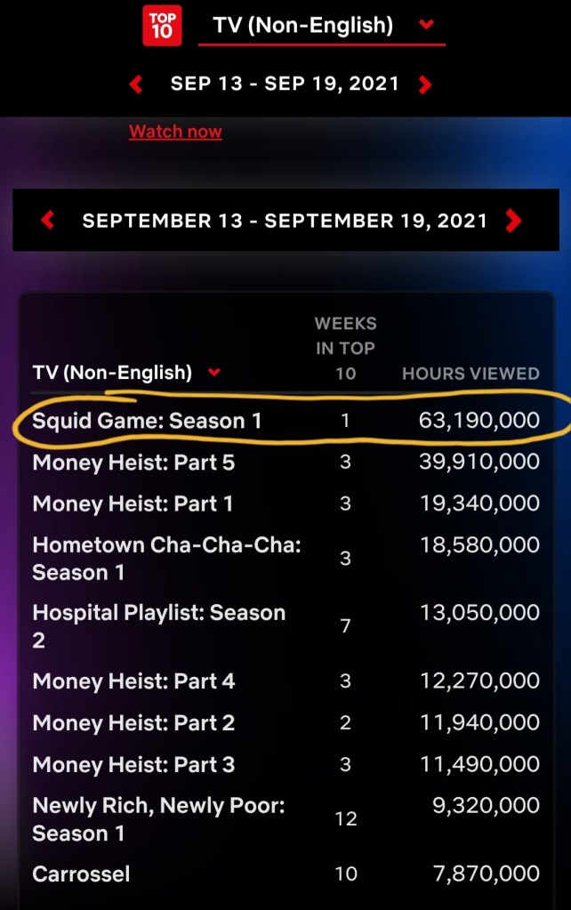 Squid Game (2021) alone attained a whopping 2.28 billion viewing hours since it was released in September 2021 and remained on Netflix’s Global Top 10 for 19 weeks.