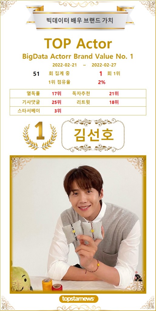 Kim Seonho had been consistently listed on the weekly Top 5 overall ranking of big data actor brands for the month of February. This time, he took the no.1 position with a total brand value score of 50,192 points.