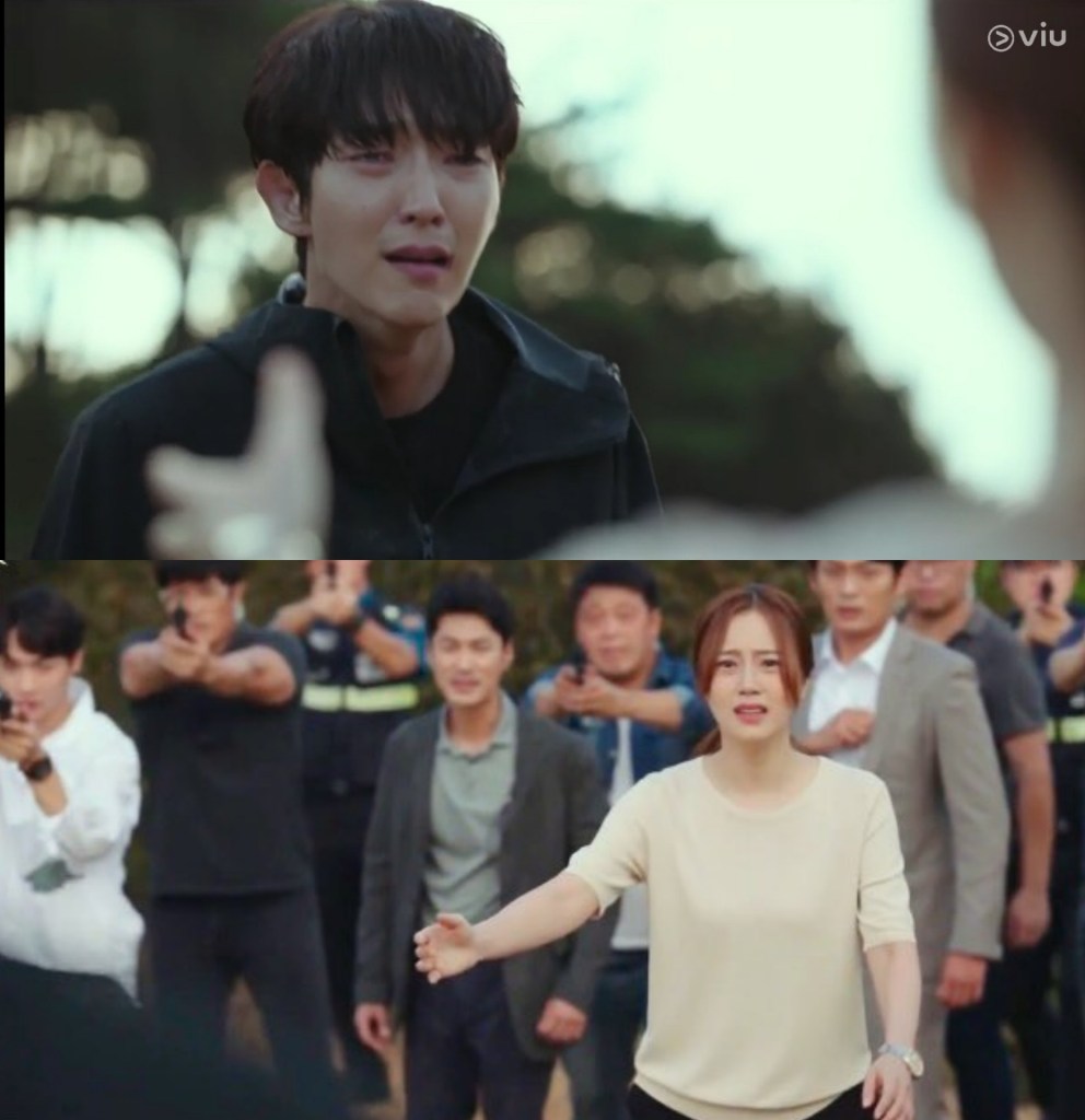 A tear-jerker scene. Lee Joon-gi as Do Hyun-soo and fake Baek Hee-sung is highly determined to kill the psychopath-serial killer, the real Baek Hee-sung, when his wife, Detective Cha appears with the police squad. Confused about his wife’s death and still seeing his dead father, he cries helplessly not knowing what to do. Detective Cha tries to calm him down, convince him that she is real, and pleads him to drop the knife and come to her.