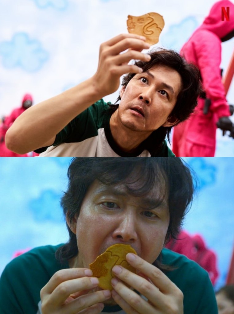 Player 456 or Seong Gi-hun played by Lee Jung-jae, survives the “Red Light, Green Light” game and proceeds to the next game, โSugar Honeycombsโ, also known as โDalgonaโ where players are shot dead if they break the shape or unable to complete the mission within 10 minutes. Anxious with the remaining time left, Seong Gi-hun finds a brilliant way to remove the most complicated umbrella shape, “This is it. I can melt it from the back.” He licks it with his tongue until he manages to remove it without a crack. The man with the umbrella survives. Whew.