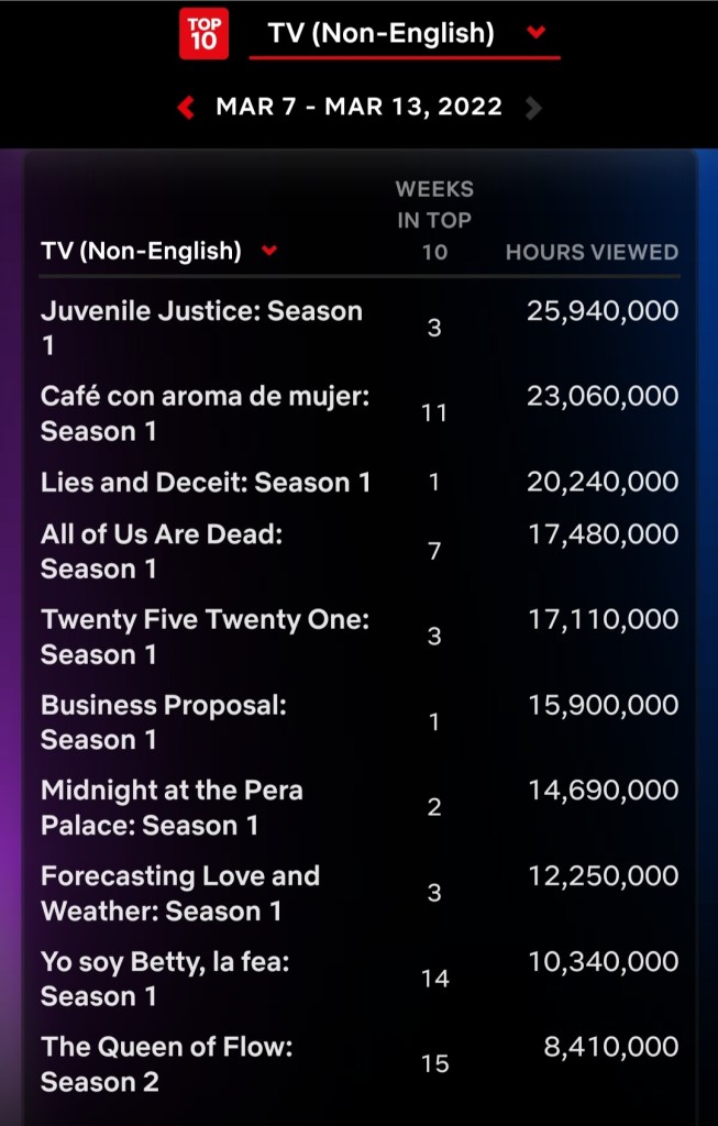 Meanwhile, the legal-crime series, Juvenile Justice, which premiered on February 25, has obtained a total of 89.2 million viewing hours since its release and remain on Top 10 in TV in 19 countries from Asia, Africa, and in the Americas.