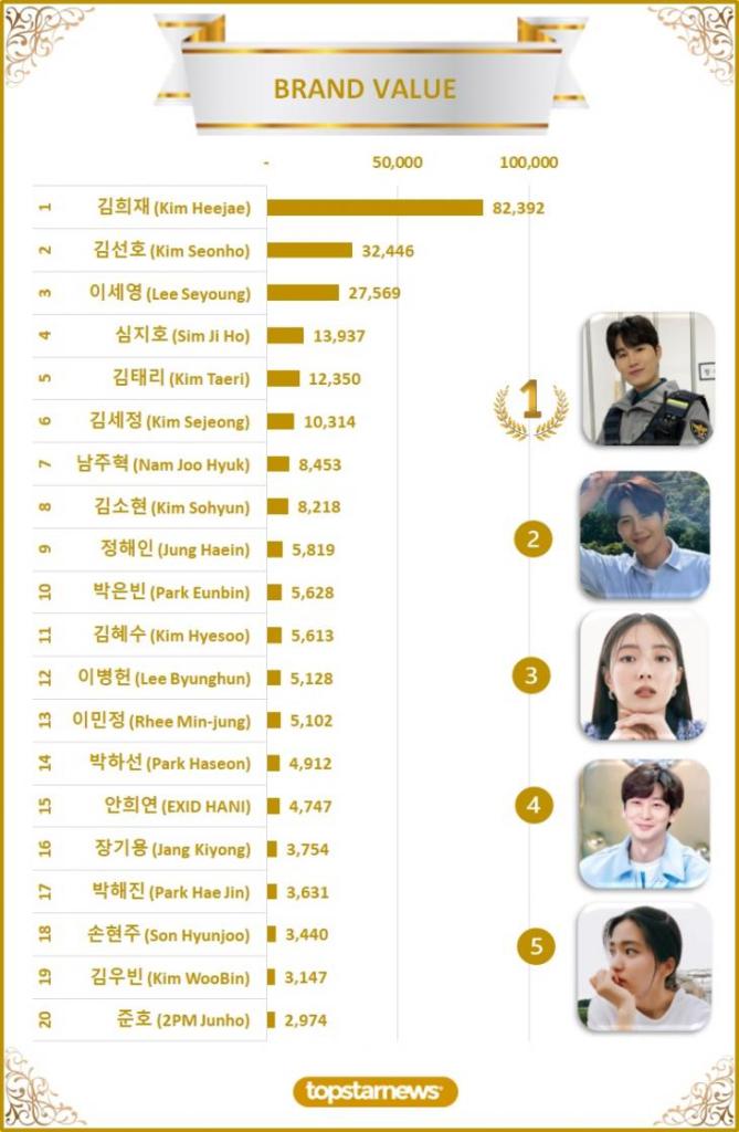 Kim Tae-ri rose to 5th spot with an overall brand value score of 12,350 points. According to Top Star News, a total of 803 articles were included in the aggregate analysis. The Twenty-Five Twenty-One star obtained 10,220 points for reading rate, 1,285 points for reader recommendation, 834 points for retweet with clicks, and 11 points from star survey.