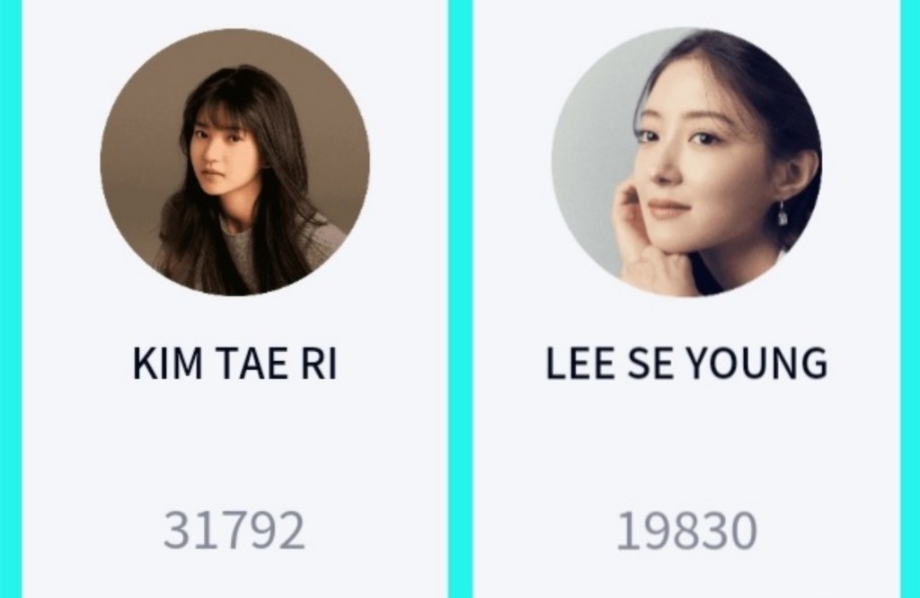 Looking at the female category, the fencing prodigy in Twenty-Five Twenty-One (2022), Kim Tae-ri ranks 1st place with 31,000+ votes while Lee Se-young, who played the court maid in The Red Sleeve (2021), takes second place with 19,000+ votes, so far.