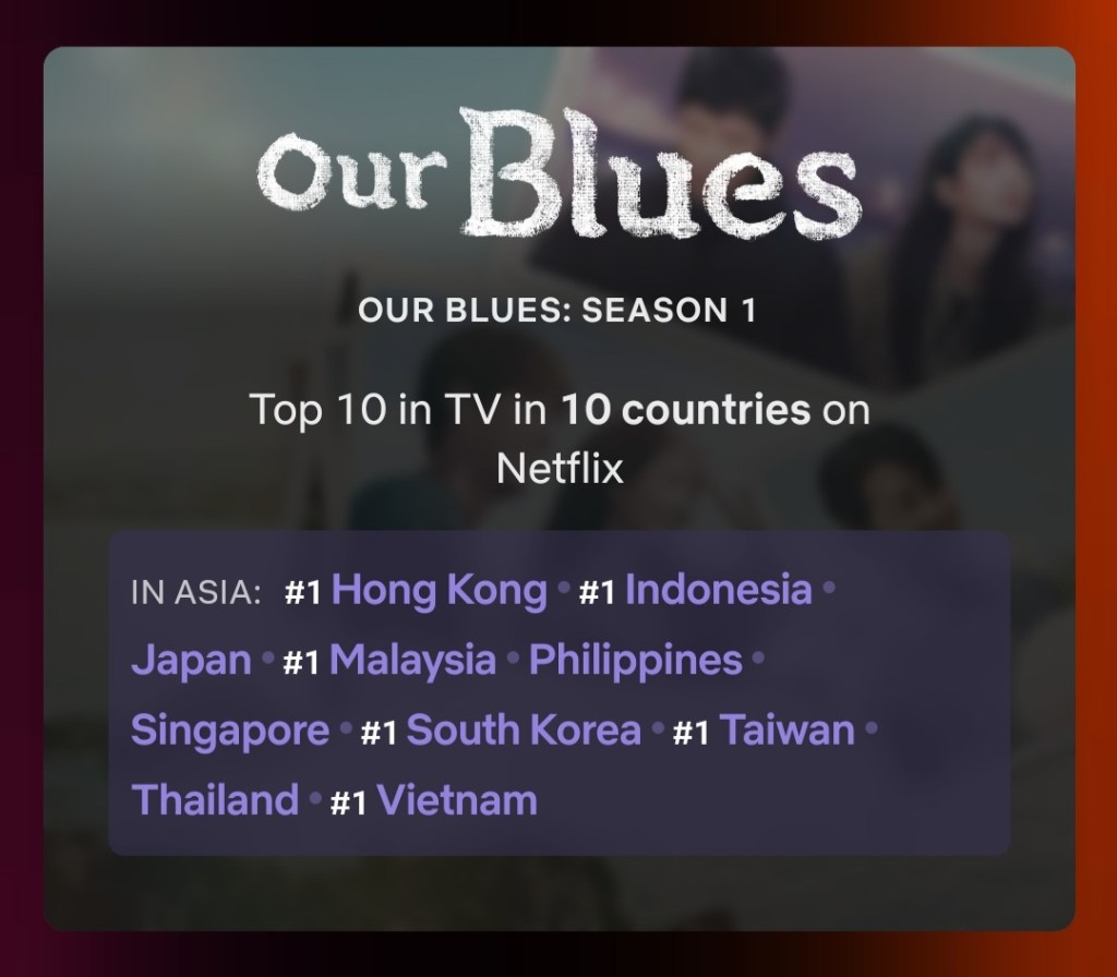 Netflix has released its Top 10 most-watched list for the week of June 13 to 19 and only (2) Korean titles made it to the global charts. Our Blues (2022) has landed at no.1 spot in six (6) countries while Squid Game (2021) has re-entered Top 10.