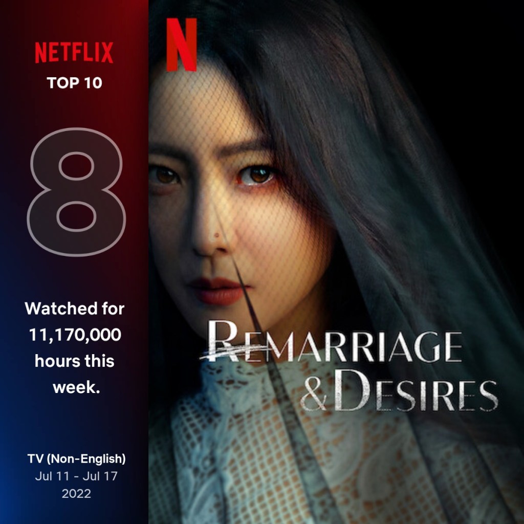 Remarriage & Desires (2022) took 8th place worldwide in the non-English TV category and has so far obtained 11.1 million viewing hours. It reached Top 10 in TV in 9 countries from Asia including Hongkong, Indonesia, Japan, Malaysia, Singapore, South Korea, Taiwan, Thailand, and Vietnam.