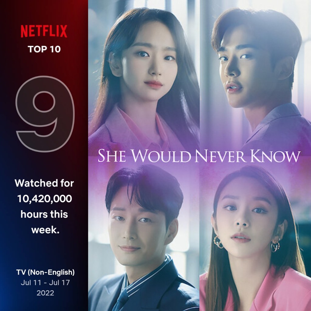 She Would Never Know (2021) achieved 9th place worldwide and has been watched so far for 10.4 million hours. It is popular in 9 countries including Indonesia, Malaysia, Maldives, Philippines, Qatar, Sri Lanka, Taiwan, Thailand, and Vietnam.