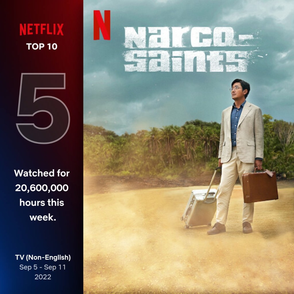 Netflix original series, Narco-Saints (2022) took 5th place with 20.6 million viewing hours. It reached Top 10 in TV in 13 countries from Asia, Africa, the Americas, and has landed at no.1 spot in South Korea. The crime-action series is based on true events that follows an ordinary entrepreneur who gets entangled with a Korean drug lord and becomes a secret agent to capture the target in South America.