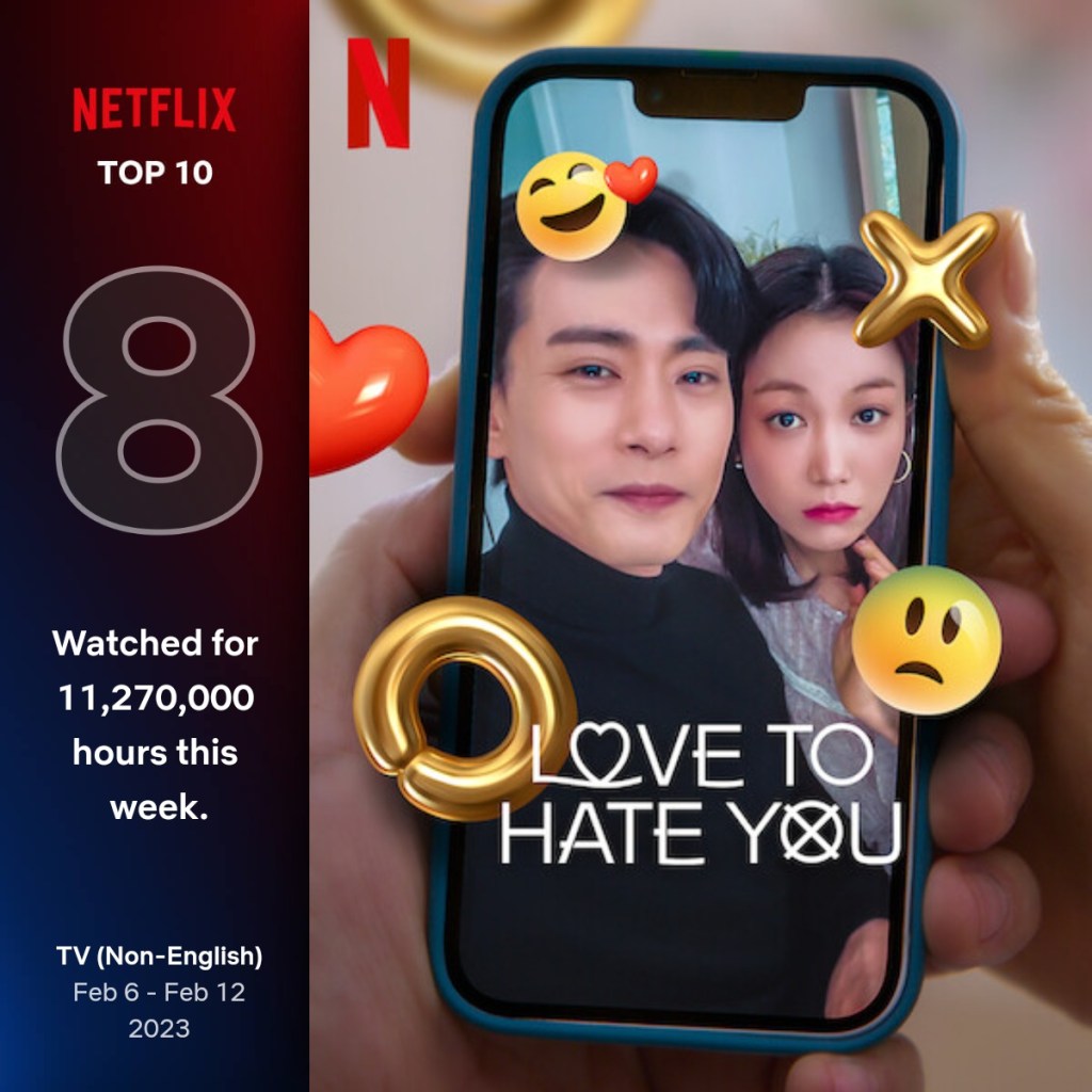 Love To Hate You (2023) took 8th place with 11.2 million viewing hours. It reached Top 10 in TV in 10 countries including Brazil, Jamaica, Martinique, Romania, Indonesia, Japan, Malaysia, Philippines, Singapore, and Thailand. The romantic-comedy series is a Netflix original that depicts the thin line between love and hate, with two people healing in a war-like romance—a woman who despises losing to men and a man who distrusts women. It stars Kim Ok-vin, Teo Yoo, Kim Ji-hoon, and Go Won-hee.