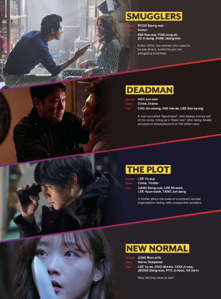 Among the several shows featured, seven Korean films were included by the Korean distributor, Contents Panda, namely Soulmate starring Kim Dami, Tastes Of Horror starring Lee Joo-young, Smugglers starring Kim Hye-soo, Deadman starring Cho Jin-woong, The Plot starring Gang Dong-won, New Normal starring Lee Yumi, and The Childe starring Kim Seonho.