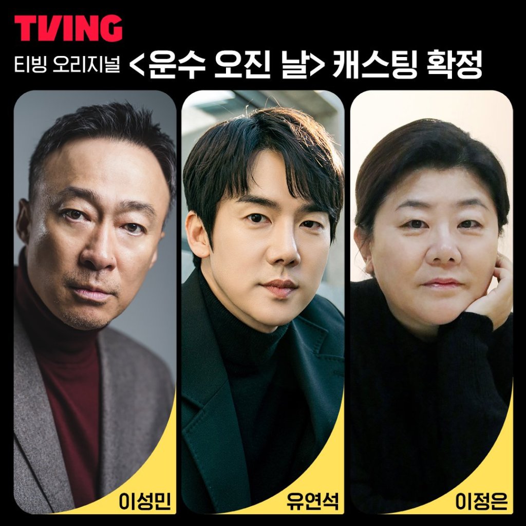TVINGโsย A Very Lucky Dayย (2023) is based on the webtoon of the same name by Aporia about a taxi driver who is offered one million won by a passenger headed to Mokpo only to find out that he is a serial killer. Lee Sung-min will play the taxi driver, Yoo Yoon-seok will portray the killer, while Lee Jung-eun was cast to play the mother of a murdered victim. The series will be helmed by Pil Gam Sung and is expected to be released in the second half of the year.