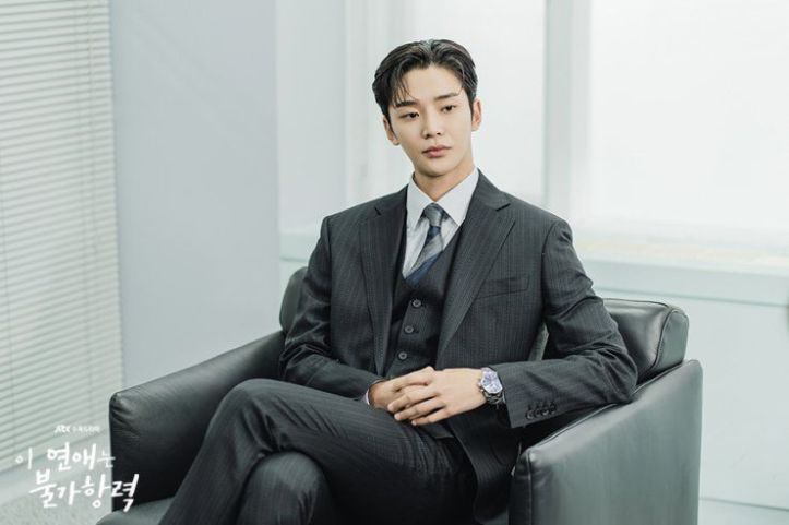Bae In-hyuk as Kang Tae-ha in the historical-romance drama, The Story of Park’s Marriage Contract (2023) is an icy and emotionally detached chaebol heir who suffers from a congenital heart disease and childhood trauma. His life transforms when he meets a strange woman from the 19th century Joseon who time-travels to modern day and insists that he looks exactly like her husband who passed away during their wedding day.